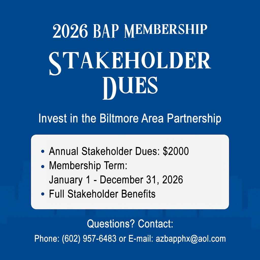 This prestigious membership level is designed for local industry business leaders who have a vested interest in the development of our community and who choose to be directly involved with civic and community issues. To qualify for the Stakeholder Member, business must be located within the boundaries of the Biltmore Area Partnership (Squaw Peak Preserve to Campbell and 16th Street to 44th Street). See more details below.